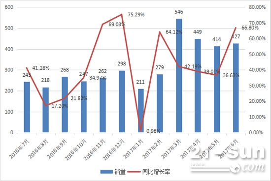 2017年6月份,11家纳入统计的平地机生产企业合计销售平地机427台,相比去年同期的256台,大幅增长66.80%。